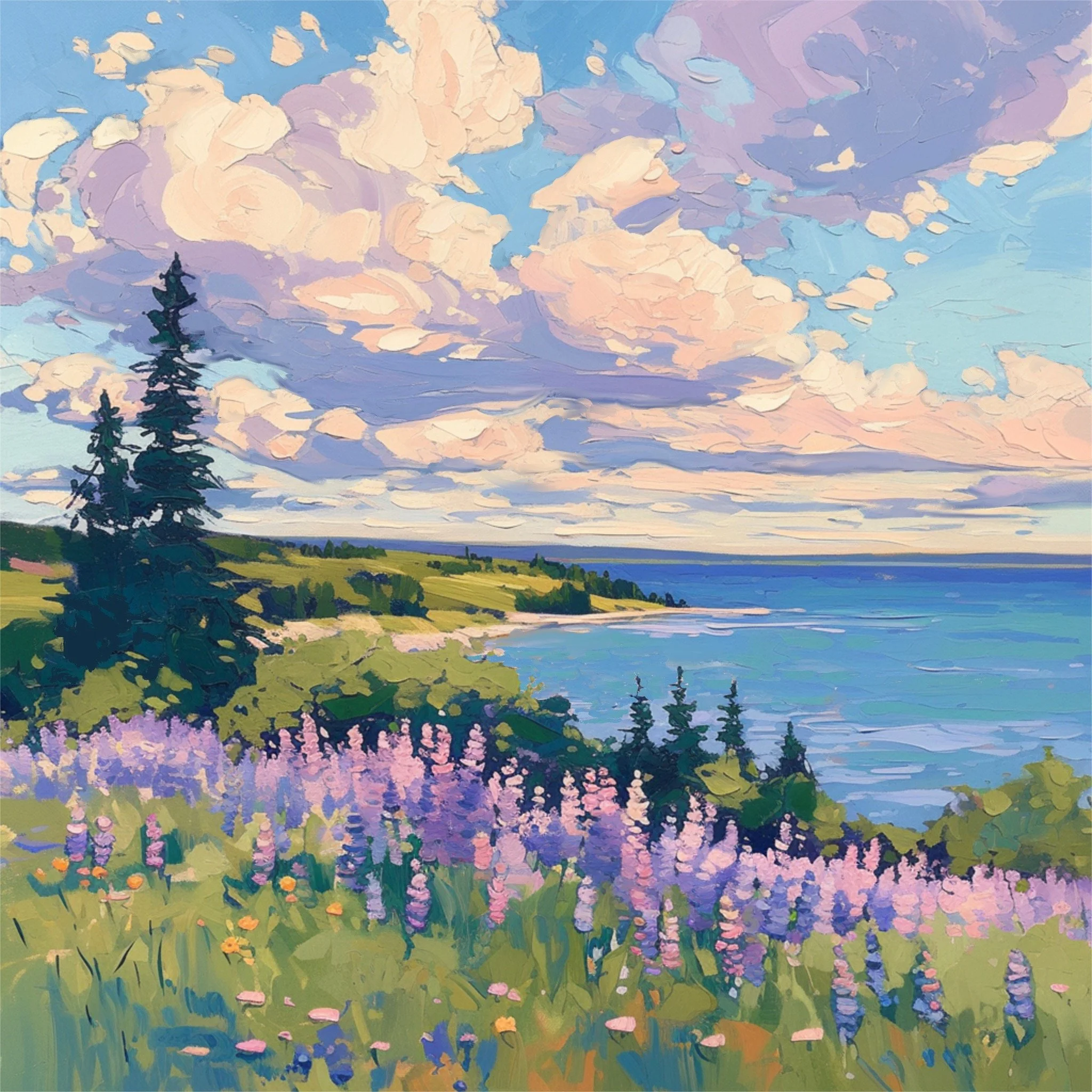 These joyful lupines are standing tall in a green field dotted with pops of wildflowers. The dark trees provide a nice contrast while echoing the vertical nature of the Lupines. These springtime colors are echoed nicely up in the clouds bringing a lovely harmony to this composition.